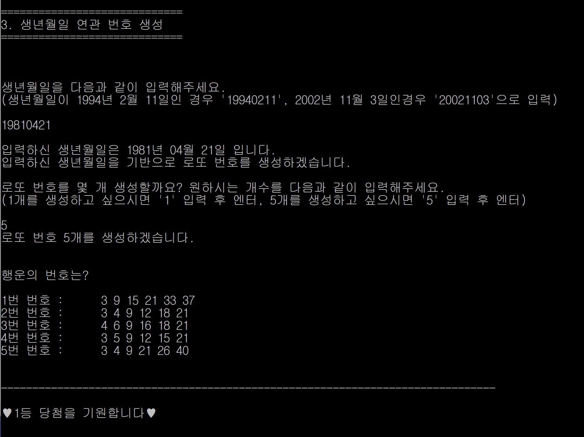여기까지 하면 생년월일을 기반으로 로또 번호를 생성하는 부분은 끝이다. 다른 메뉴와 마찬가지로, 사용자가 원하는 로또 번호 개수를 생성할 수 있는 기능도 포함하였다.