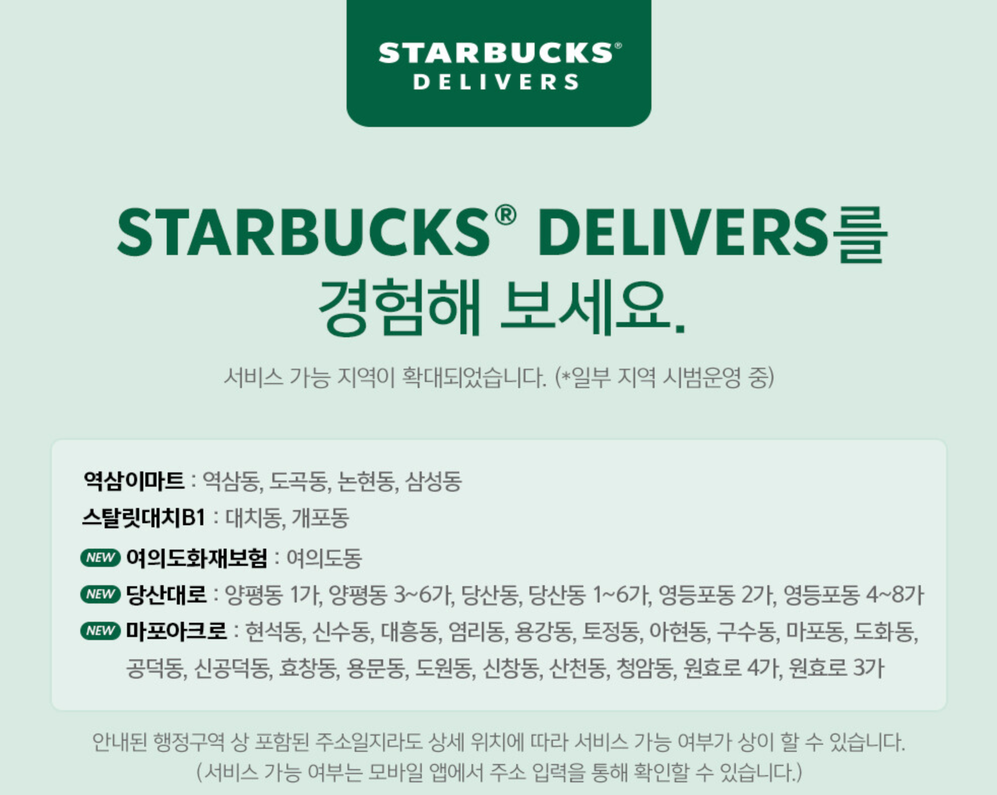 현재(2021년 1월 26일 기준) 스타벅스 딜리버리 이용 가능한 매장. 지속 확대중.