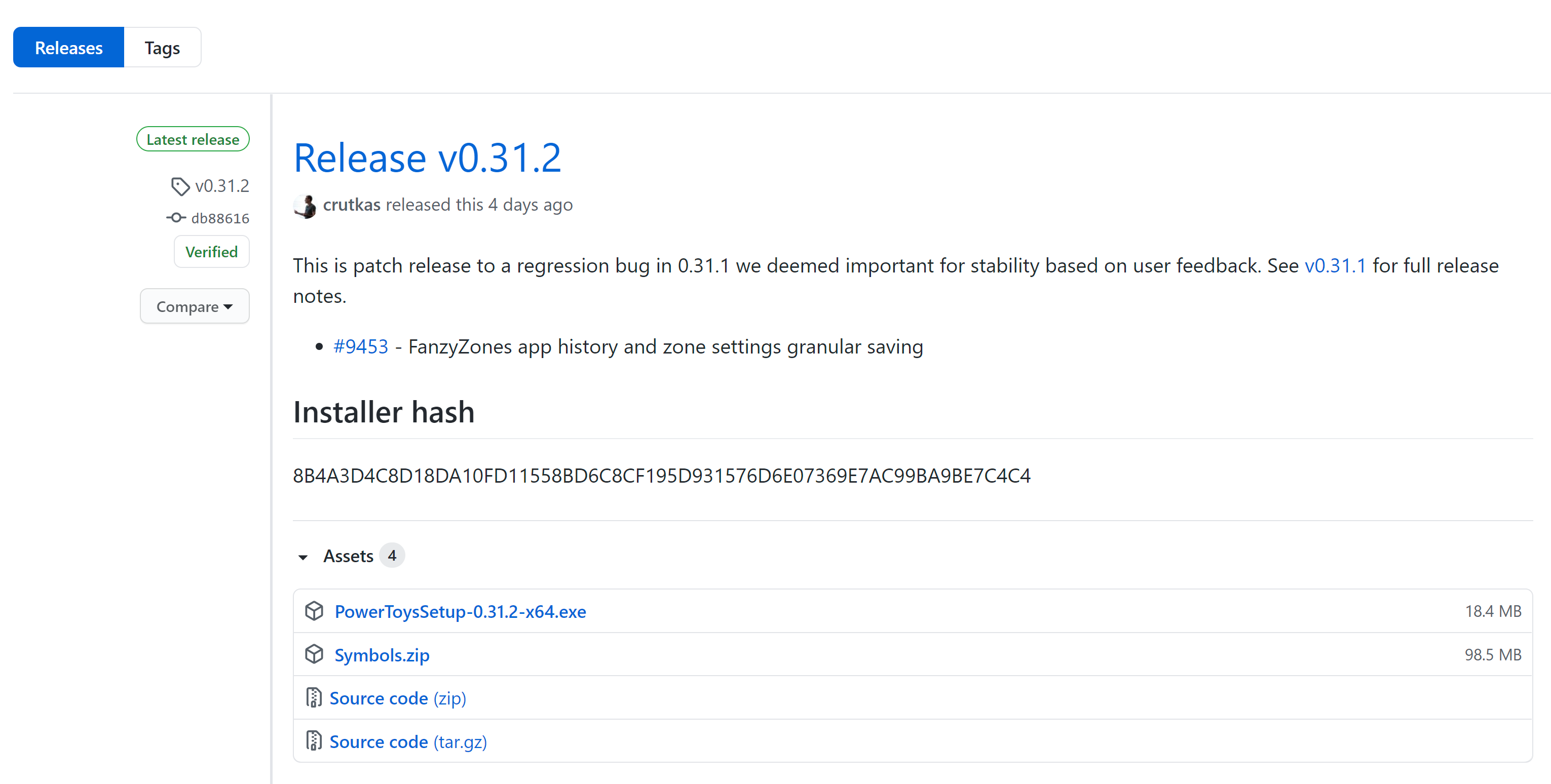 현재 0.31.2버전까지 나와있고, PowerToysSetup.exe 파일을 다운받아 설치하면 된다.