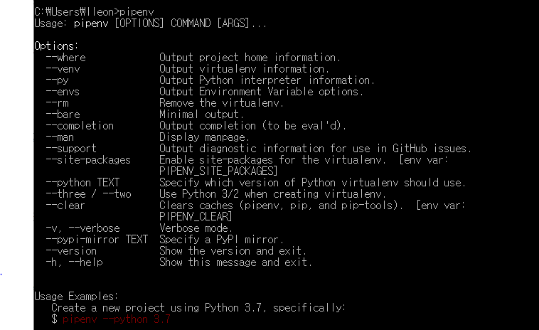 4. cmd에 pipenv를 입력하여 설치가 잘 되었는지 확인해본다.