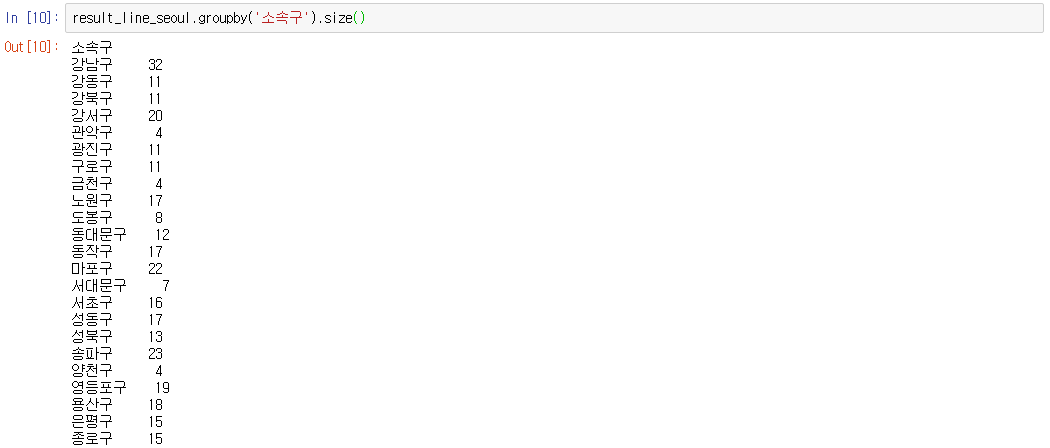 즉, '소속구' 열은 범주형 데이터로 이루어져 있고, 저는 각 범주의 값이 몇개인지 알고싶은 것입니다!