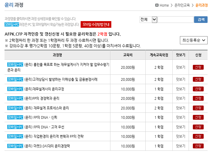 저 또한 사이버과정을 통해 계속교육학점을 취득하였는데요, 윤리교육을 들었던 한국FP협회 금융교육센터에서 강의를 수강했습니다.
