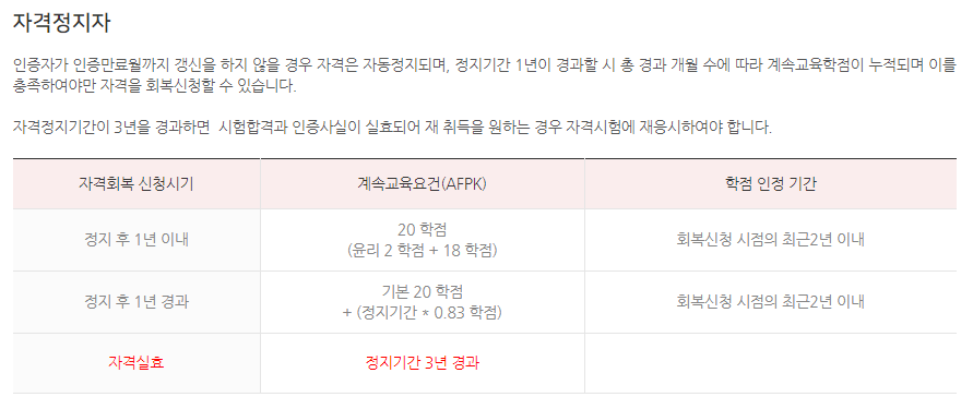 AFPK 자격 갱신을 하지 않을 경우 정지일로부터 3년이 경과하면 AFPK 자격이 실효되니 참고바랍니다!