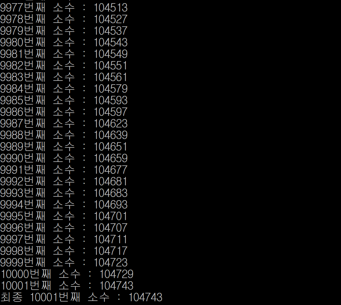 - 충분히 큰 수를 위 코드에서는 1,000,000,000 (10억)으로 설정했는데, 10001번째 소수가 이보다 큰 값이면, 시행 값을 다시 설정해야 한다.